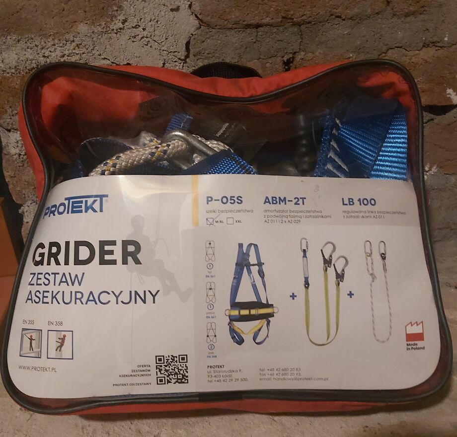 GRIDER - Zestaw powstrzymujący upadek do pracy w podparciu, do pracy na rusztowaniach - rozmiar szelek M-XL preferowany odb osobisty Boguchwała ewentualnie mogę wysłać pocztą polską za pobraniem na twój koszt przesyłka dodatkowoW skład zestawu wchodzą: